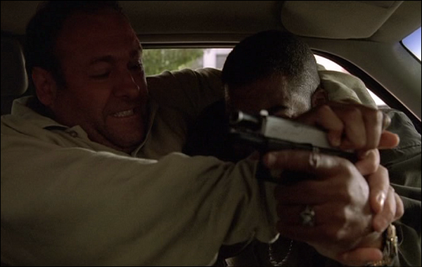The first season’s bad guy Mikey Palmice gets whacked in this scene by killers Christopher and Paulie. For a second it appears that he is going to escape when he runs into the forest, but Christopher is a wickedly fast runner and catches up with him and puts one in his leg. Then Mikey begs for his life before Paulie and Chris pump him full of lead. A lesson from Coppola: It is important to add a detail to a murder scene to make it memorable. In this scene, Poison Ivy does the trick. Paulie runs into some bushes of the stuff and immediately can feel it itching on him. This gives him all the more reason to whack Mikey, while Christopher already has a personal reason for the kill: “You shot Brendan Filone in his bathtub naked, no chance to run!”